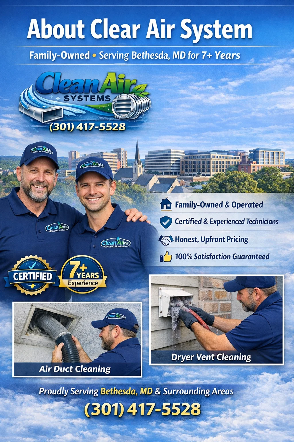 At Clear Air System, we proudly serve homeowners and businesses throughout Bethesda, Maryland with professional air duct and dryer vent cleaning services.